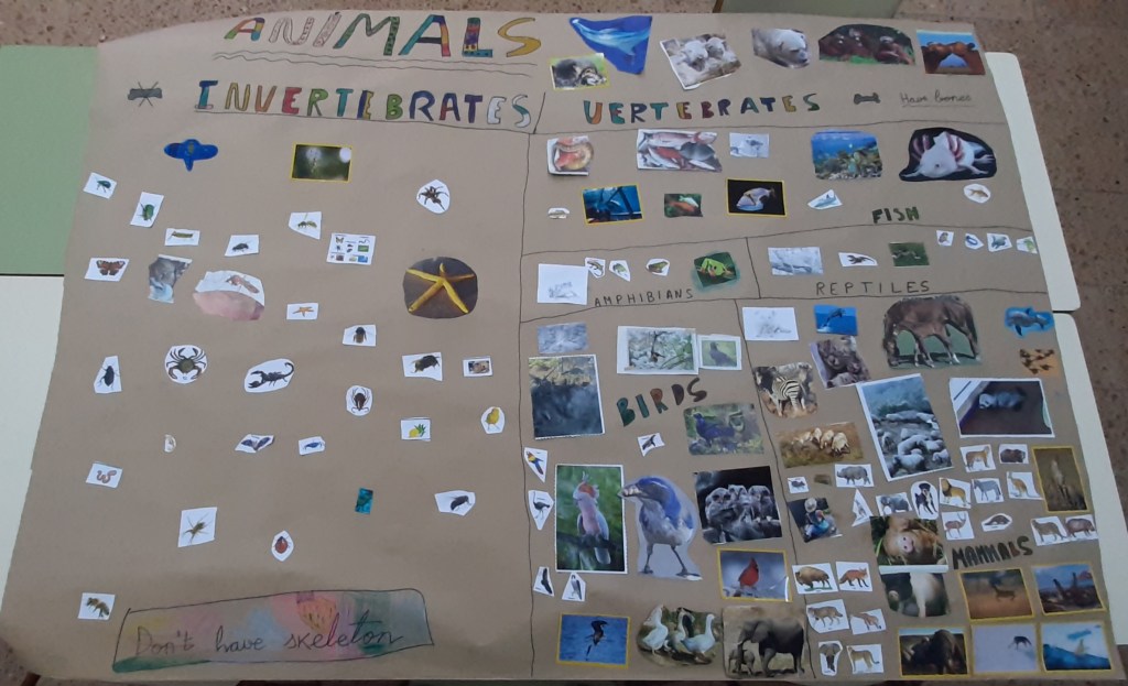 Hoy hemos realizado entre todos los niños y niñas de 1° de Primaria este mural sobre la clasificación de los animales. Esta actividad pone fin a la unidad 3 de Natural Science. Ha quedado muy bonito. La nota del trabajo será positiva. Muchas gracias a las familias por la rapidez en la aportación de las imágenes.