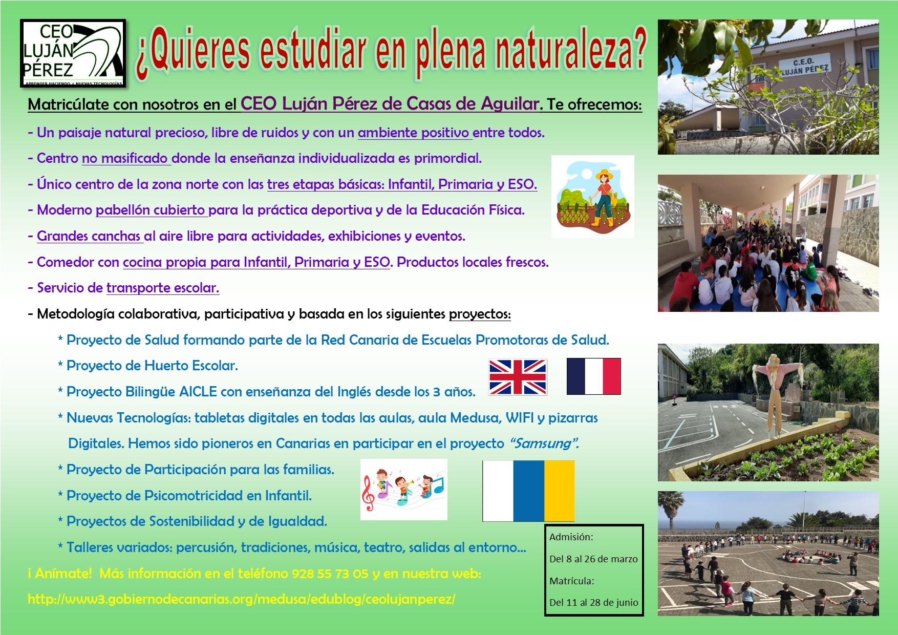 Estimadas familias, el período de solicitud de plazas para el próximo curso 2020-2021 comenzará el 9 de marzo y concluirá el 31 de marzo. Nos gustaría que aquellas personas que estén interesadas en conocernos se acerquen al centro cuando deseen, sobre todo el día jueves 12 de marzo, que será el día oficial de puertas abiertas. Pueden contactar en el teléfono 928557305. Estaremos encantados de atenderles y mostrarles el centro.